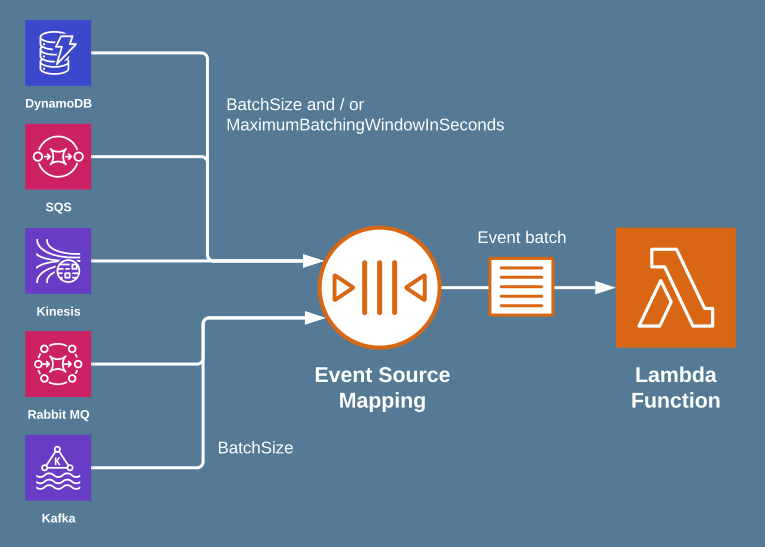Event Source Mappings are a free service provided by AWS as part of their Lambda offering. They sit between a source queue or stream and a Lambda Function. They read messages up to a configured maximum, and then forward those messages as a batch to a Lambda Function.