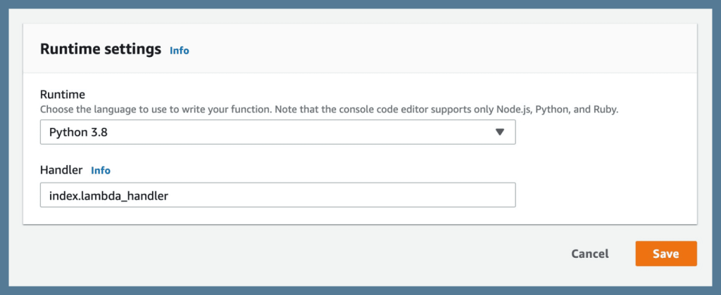 The actual request is performed by the Lambda execution handler – the function in your code you’ve designated as the entry point for your Lambda function. In the screenshot below you can see the function lambda_handler() in the file index.py has been configured as the handler function.