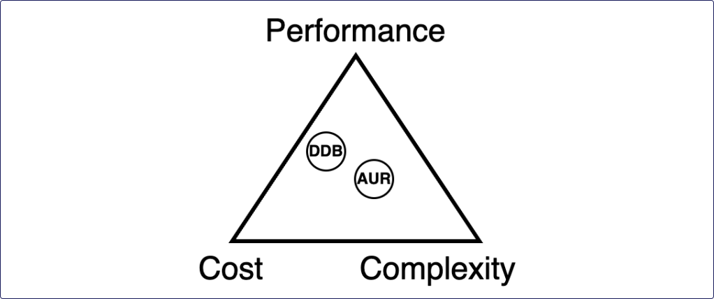 The answer is replacing the reliability property with complexity. Let me explain this with a common example: Aurora Serverless versus DynamoDB. Often DynamoDB will provide better and more predictable performance at higher cost-efficiency, but at the cost of complexity. Suddenly you need to manage complex data models in your application layer, you need to predict all your access patterns, and schema migrations are a headache. On the other hand a relational database is much easier to use and evolve, but it might have lower performance and higher cost. Please note that the exact opposite argument can also be made. In many cases Aurora will be more cost effective and performant. The truth completely depends on your context and use case.