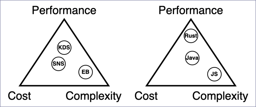 After reading about Serverless’ limited compute model, you might be surprised to see performance as one of the trilemma’s properties. After all, at first glance we seem not to have much influence on it. If we look a little deeper, however, we will find that we can actually affect performance quite a bit. Generally performance can be expressed as latency: the time it takes to receive a response, the time it takes to complete a process, the time-until-first-byte, and various other delays in a system. Many design choices affect latency. For example, an EventBridge event bus takes more time to deliver a message than SNS, while Kinesis Data Streams (with enhanced fan-out) is even faster. But each solution also affects cost and complexity, which should be considered in the trade-off decision.
