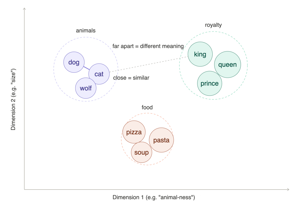 The technology which powers semantic similarity comparison is an embeddings model. This model converts input (e.g. text or images) to a numeric representation known as vectors. These vectors are also called the input’s embeddings. In the example below we have vectors in two dimensions: animal-ness on the X-axis and size on the Y axis. Words like dog, cat, and pizza get a score on each of these dimensions. Because related words get similar values, words which are close together have similar meaning. In the example we use two dimensions, but modern embeddings models use hundreds or thousands of dimensions to classify input. Unfortunately it is impossible to visually represent more than three dimensions on a computer screen.
