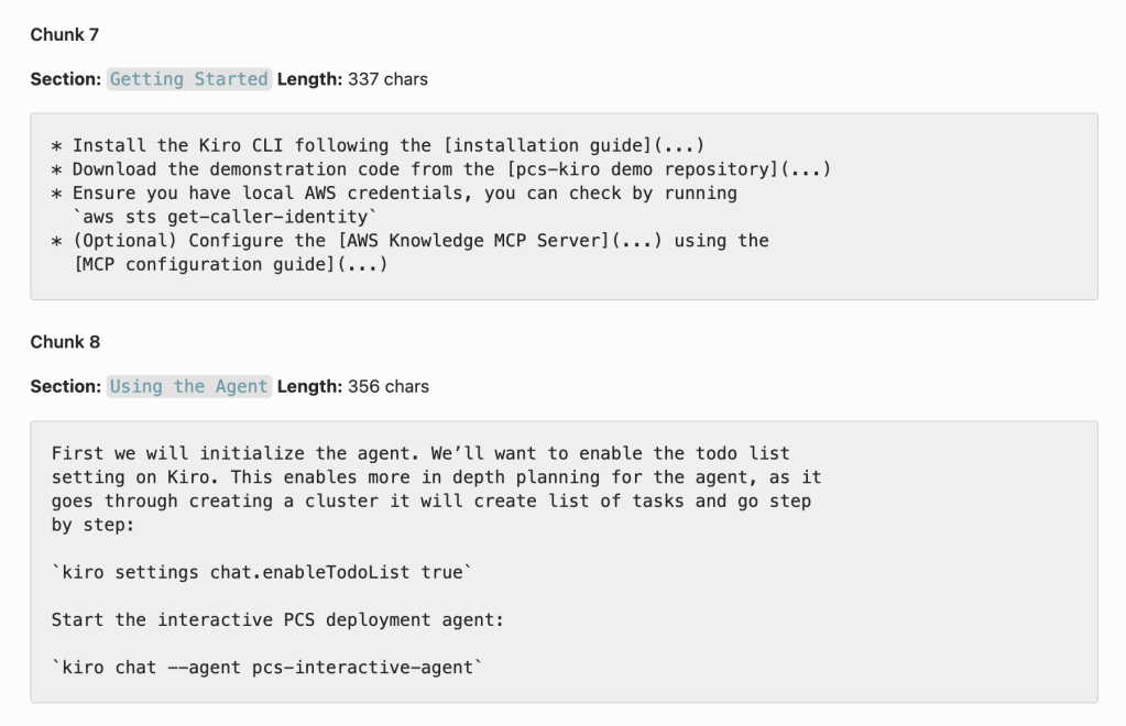 As you can see, the result is a list of reasonably sized chunks with pure content, each with exact semantic meaning. These chunks are fed into the embeddings model and then stored in the vector database for querying and retrieval.