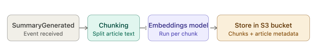 The embeddings process listens to the SummaryGenerated event. When it is received, it starts the chunking process, runs the embeddings model on each chunk, and then stores the batch of chunks in the S3 vector bucket, including the metadata about the original article.