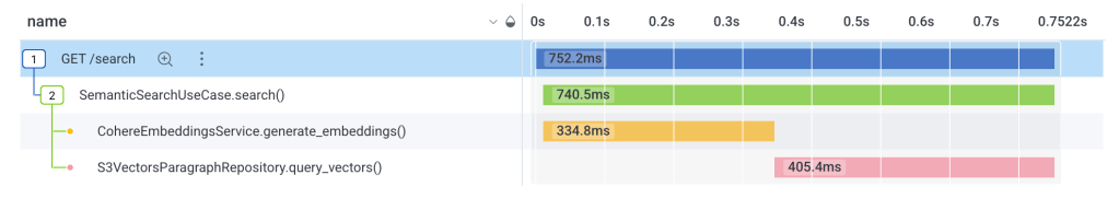 To visualize the process (and to see how simple it really is), consider the observability trace for the GET /search request below. The search results were returned in about 750ms, with about 330ms spent on creating embeddings and about 400ms on querying the vector bucket.